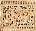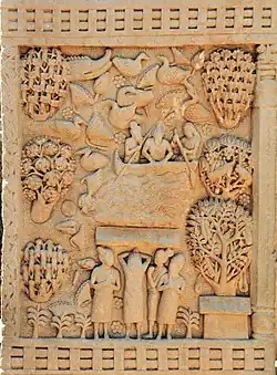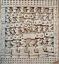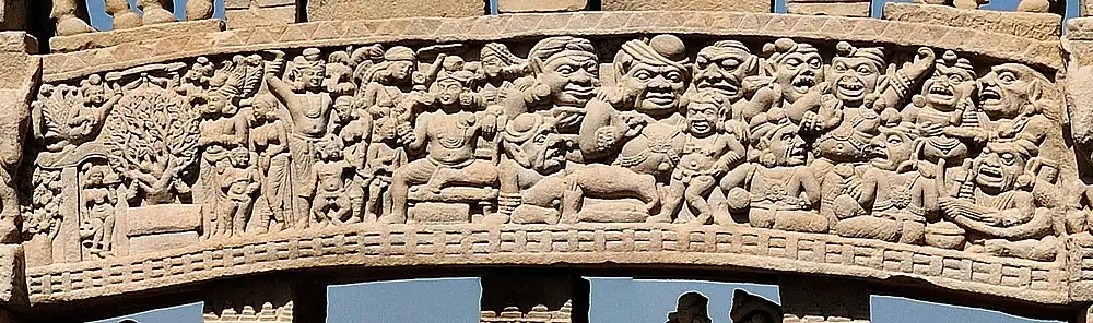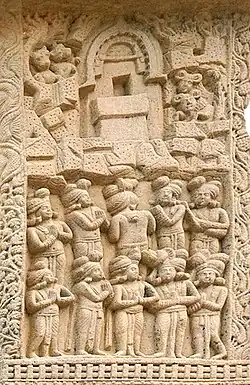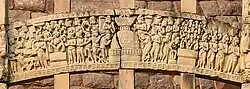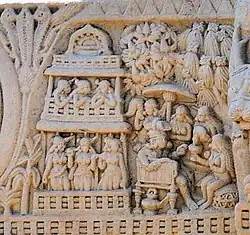 Although made of stone, the torana gateways were carved and constructed in the manner of wood and the gateways were covered with narrative sculptures. It has also been suggested that the stone reliefs were made by ivory carvers from nearby Vidisha, and an inscription on the Southern Gateway of the Great Stupa ("The Worship of the Bodhisattva's hair") was dedicated by the Guild of Ivory Carvers of Vidisha.[41][42]