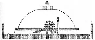 ![]() Approximate reconstitution of the Great Stupa with its pillar of Ashoka, under the Mauryas c. 260 BCE. |