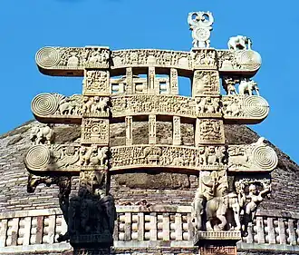 The Satavahana Empire under Satakarni II conquered eastern Malwa from the Shungas.[39] This gave the Satavahanas access to the Buddhist site of Sanchi, in which they are credited with the building of the decorated gateways around the original Mauryan Empire and Sunga stupas.[40] From the 1st century BCE, the highly decorated gateways were built. The balustrade and the gateways were also colored.[6] Later gateways/toranas are generally dated to the 1st century CE.[26]