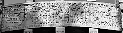 The decorations of Stupa No. 2 have been called "the oldest extensive stupa decoration in existence",[29] and this Stupa is considered as the birthplace of Jataka illustrations.[30] The reliefs at Stupa No.2 bear mason marks in Kharoshthi, as opposed to the local Brahmi script.[27] This seems to imply that foreign workers from the north-west (from the region of Gandhara, where Kharoshthi was the current script) were responsible for the motifs and figures that can be found on the railings of the stupa.[27] Foreigners from Gandhara are otherwise known to have visited the region around the same time: in 115 BCE, the embassy of Heliodorus from Indo-Greek king Antialkidas to the court of the Sungas king Bhagabhadra in nearby Vidisha is recorded, in which Heliodorus established the Heliodorus pillar in a dedication to Vāsudeva. This would indicate that relations had improved at that time, and that people traveled between the two realms.[32]