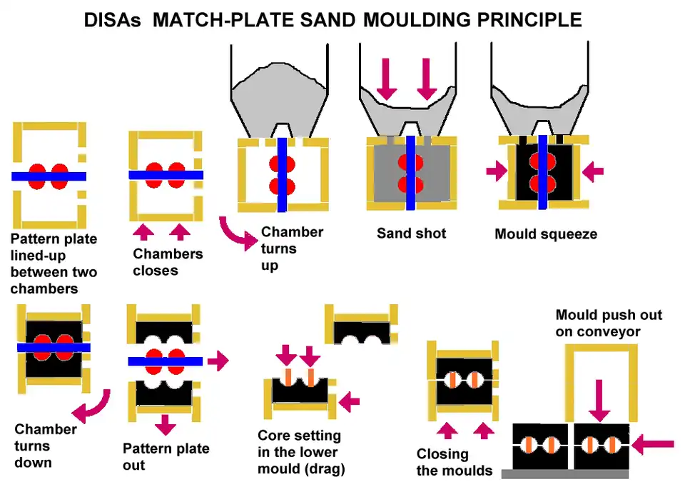 The principle of the matchplate, meaning pattern plates with two patterns on each side of the same plate, was developed and patented in 1910, fostering the perspectives for future sand molding improvements. However, first in the early sixties the American company Hunter Automated Machinery Corporation launched its first automatic flaskless, horizontal molding line applying the matchplate technology.