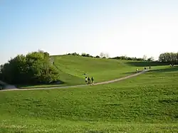 The hill is mainly artificial but the area has served as a park and recreational area for the inhabitants of Lund for centuries. The present hill was originally a common where people from Lund could let their livestock graze. The area was also used as a park where people celebrated Midsummer's Eve around the formerly sacred Saint Hans (Saint John's Well) that was situated on the eastern slopes of the hills. The well has disappeared or been covered over and all attempts to retrieve it have been vain. In 1947 Lund Council turned the common into a waste disposal area. It remained in use until 1954.[1] The modern recreational area was constructed in the 1970s, giving the area its current form.[1] Pollution remained an issue – the Valkärra stream, which flows through the park, was contaminated by leaking water, leading to fish mutations[2] – and the municipality financed a new decontamination project, starting in 2013, to protect water bodies in the area.[3]