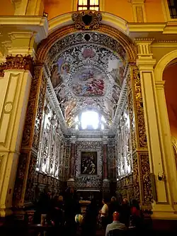 Among the altarpieces in the church is a depiction of the Blessed Geremia (1785) by Antonio Manno in the left transept, and a depiction of Saint Agnes of Montepulciano (1603) by Filippo Paladini. The first chapel on the right transept, dedicated to the Madonna del Rosario, survived the bombardment. It is richly decorated with polychrome marble and small tableux made with stucco (1697-1721) by Gioacchino Vitagliano. These teatrini or dramatic set-pieces depict the scenes of the Mystery of the Rosary. The ceiling is frescoes framed with elaborate stucco with the five glorious mysteries of the Rosary, by Pietro Aquila.[1] These tableux can be compared to the ones made by Serpotta for the adjacent oratory.