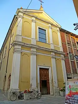 A chapel at the site is documented since 1230, erected under the patronage of the aristocratic Pinchelini (Pincolini) family. In the 15th century, a hospital arose adjacent to the chapel, dedicated to caring for the pilgrims called mysteriously in some documents "degli Scoatti" (Scivatorum, Scopatorum). Later the church was assigned to the Flagellant Confraternity of the Disciplinati, who were devoted to the Virgin of the Annunciation. The church was rebuilt in 1600. When the hospice and confraternity were suppressed by Pope Pius VI in 1778, the property was transferred to the hospital of the city. However, in 1785, with the closure of the church of Santi Giovanni Battista e Giovanni Evangelista, this was converted into a parish church.[1] The interiors were frescoed in the 17th century by Antonio Formaiaroli. In 1970, the nave was elongated.