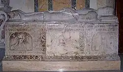 The architect Giuseppe Ferrara designed and helped sculpt the richly articulated facade. The detached bell-tower was begun in 1773; however, it was never completed, and the stunted building only rises two stories. The main altarpiece, carved in 1753, displays a Nativity of the Virgin by Olivio Sozzi. The third altar on the left displays a Martyrdom of St. Bartholomew (1694), commissioned by the guild of the tanners, active in Militello, in honor of their patron saint. The fourth altar on right houses a glazed terracotta depicting the Nativity by Andrea della Robbia; this work was commissioned in 1487 by Antonio Pietro Barresi, baron of Militello, for the prior church of Santa Maria della Stella. A number of works from the churches ruined by the earthquake were reused, including a Scourged Christ (17th century) from the church of Sant'Antonio Abate; a portal likely from the prior Santa Maria church, and a sarcophagus for Blasco II Barresi (15th-century) and Vincenzo Barresi, first Marquis of Militello (1567).