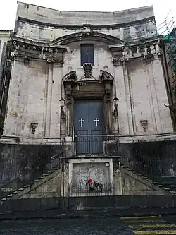 Monks of the order of Discalced Carmelites arrived in Catania in 1642-1643 and were initially located at the church of Santo Spirito outside town. In 1677, that church was destroyed to enhance the defenses against the besieging French army.[1] For a time they stayed in houses belonging to the nobleman Giovanni Tedeschi. The present structures, a church and attached convent were not built until after the 1693 earthquake. The church facade is set on a high black stone plinth, is accessed through a double staircase, and has a broken pediment over the portal.