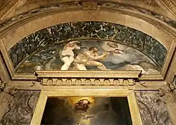 The first altar of the right aisle belonged, as can be seen from the noble coat of arms represented in the plinth of the side pillars, to the noble Orci family. The author of the altarpiece The Conversion of St. Paul, dated 1584, is the painter Bernardino India,[53] who drew inspiration from the Mantuan Giulio Romano to create it. India also made the oil painting and almost monochrome (with whitish and light yellow tones), Transfiguration of Christ, for the lunette,[38] while the decorations of the sub-arches may be attributable to the workshop of Paolo Farinati.[54]