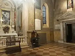The church organ, placed in the choir loft above the entrance door, is an 1852 creation by Gian Battista De Lorenzi of Vicenza and features two doors painted by Battista Brusasorzi depicting musician angels placed behind a balcony of a loggia.[38][39] There are also three confessionals made of walnut and dating back to the 16th century. Finally, as soon as one enters, one encounters two stoups made of red Verona marble, also from the 16th century.[40] The panels of the Stations of the Cross were painted in 1820.[38]