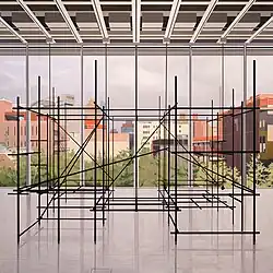 McKenzie paints with oil and acrylic on canvas. Her work captures architecture in transition. Past series have focused on construction sites, abandoned structures, hotel rooms, and parking garages– spaces that are fluid rather than fixed.[32] With White Walls, the series of paintings McKenzie created from 2014 to 2020, she depicts the architecture of exhibition space: art fair tents, minimalist museum and gallery interiors, and video-screening rooms.[33] Her work has been influenced by the writings of Brian O'Doherty, particularly his 1976 book, Inside the White Cube: The Ideology of the Gallery Space, which explores the history and development of gallery architecture in response to modern art. In 2021, with the support of the Marion Fellowship, McKenzie launched a new project exploring the architecture of the US prison system.