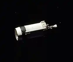 A boilerplate Apollo spacecraft, BP-027 was used for all configurations of dynamic testing.[41] The boilerplate took the place of actual flight hardware. Boilerplate size, shape, mass, and center of gravity were the same, but it was not necessary for the entire Apollo spacecraft to be completed to commence dynamic testing. The boilerplate was outfitted with instrumentation to record data for engineering study and evaluation.[42] BP-27 was accepted at the Marshall Space Flight Center in late September 1964.[43]