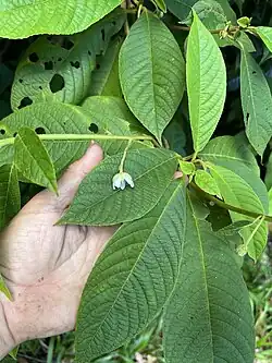 It is a shrub or small tree reaching up tp 9 m (30 ft) in height with soft wood and pithy stems. Leaves grow to 26 cm (10 in) long by 8.5 cm (3.3 in) wide and their margins (edges) have numerous small teeth. They are held on petioles about 15 mm (0.59 in) long, and are obovate in shape. Flowers are white and produced in a 3—5 flowered cyme in the leaf axils. They have five petals about 14 mm (0.55 in) long. The fruit is, in botanical terms, a berry, white or faintly purple, measuring up to 15 mm (0.59 in) wide and long, and containing numerous small seeds.[4][5][6]