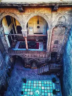 The area in front of Sayyidah Zainab Mosque was called Qantarat al-Sebaa. This referred to the bridge built by Baybars in front of Sayyidah Zeinab Mosque.[11] The bridge was carved with an image of lions, his emblem. Ibn Daqmak in his book al-Intisar called it al-Qantara al-Zahiriya. It was located on the Khalij canal and was known as Qantarat al-Sayyidah Zainab and consisted of two bridges, one of which connected Al-Kumi Street to Al-Sadd Street. The second used to connect Marasina Street to Komi Street. When al-Nasir Muhammad built the Sultan's Square and visited it frequently, he used to ride on that bridge, he was annoyed by its height, so he ordered it to be demolished and made it wider than was and shorter than its height, and the work was completed in 1325 AD. When the central part of the canal was filled in, the bridges disappeared.[12]