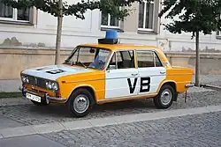 In mid-1987, the uniform of the VB was almost identical to the Czechoslovak People's Army (ČSLA) uniform, but with red shoulder boards and red trimming on hats distinguishing VB personnel from military.[1] VB vehicles were yellow and white, with the initials VB on the sides, front, and rear.[1]