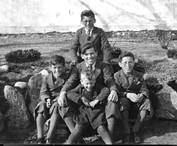 The Norwegian brigade formed in Scotland saw little action and was confined to garrison duties, in addition to training other Allied troops in winter warfare.[12] However, special units, including the distinguished Kompani Linge and the No. 5 Troop of the No. 10 (Inter-Allied) Commando with mixed Anglo-Norwegian personnel,[13] were employed in various raids along the Norwegian coast, often bringing back additional volunteers who enlisted in the Allied forces. A unit was sent to Jan Mayen island, where it operated a weather station, evacuated by the Norwegians in 1940, from March 1941 to June 1946. In Iceland, at a winter warfare school, Norwegian personnel trained 1,000 British and 3,000 American troops.[12] After the liberation, the personnel of No. 5 Troop were sent to Sweden in civilian clothes, traveled by train to Norway, and were used as guards for the Royal Palace, with many of its members later incorporated into the new Norwegian Royal Guard.[13]