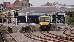 Scarborough, formerly Scarborough Central, is a Grade II listed[1] railway station serving the seaside town of Scarborough, North Yorkshire. It lies 42 miles (68 km) east of York and is one of the eastern termini on the North TransPennine route; it is managed by TransPennine Express.[2] and is also served by Northern Trains. The station is also at the northern end of the Yorkshire Coast line and is reputed to have the longest station seat in the world at 456-foot (139 m).[3]