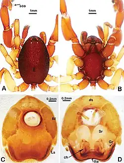 Sceliscelis marshi sp. nov., female paratype. Cephalothorax A dorsal and B ventral aspects C, D endogyne, ventral and dorsal aspects, respectively. Abbreviations: Bl – book lung operculum, ch – receptive chamber, ds – dorsal portion of scutum, Gr – grape-shaped glands, Ls – lateral sclerite, Re – rigid extension of posterior wall of epigastric fold, sco – scopula, Sr – sac like receptacle. Scale bars: 1 mm (A, B), 0.2 mm (C, D).