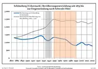 Development of population since 1875 within the final boundaries (Blue line: Population; Dotted line: Comparison to population development of Brandenburg state; Grey background: Time of Nazi rule; Red background: Time of communist rule)