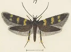 9-10 mm. Head, antennae, and thorax dark bronzy-fuscous. Palpi rather dark fuscous, internally whitish-ochreous, terminal joint as long as second. Abdomen dark fuscous, apex whitish-ochreous. Fore-wings elongate, narrow, costa gently arched, apex round-pointed, termen very obliquely rounded; fuscous, slightly purplish-tinged, irrorated with dark fuscous and blackish; a straight rather narrow fascia at 14, a small spot in middle of disc, and opposite subcostal and subdorsal spots at 34 pale ochreous-yellow, irregular-edged : cilia fuscous, mixed with dark fuscous towards base. Hind-wings dark fuscous; cilia fuscous, with dark fuscous basal shade.[4]