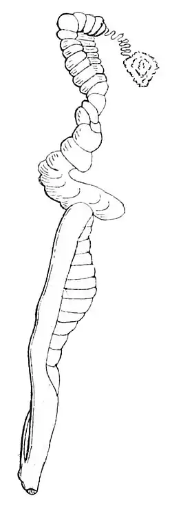 The reproductive system is remarkable for extreme reduction of male organs and the absence of receptaculum seminis (spermatheca). The male organ (penis) is a short tube, and exhibits little difference from the vas deferens, except that it is slightly wider; the latter is a short tube not sharply marked off from the verge. The albumen gland is large.[7]