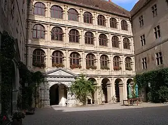 Inside the south wing overlooking the Bodensee, the Knights' Hall (German: Rittersaal) was constructed between 1580 and 1584, one of the most magnificent ballrooms of the late German Renaissance.[1][4][5] The room is, together with the knight's hall in Schloss Weikersheim, one of the few surviving state rooms of this time.[1] The richly carved coffered ceiling hanging from the roof structure was created by Jörg Schwartzenberger from Meßkirch.[1][2] The chimney structures on the sandstone chimneys on the narrow sides with niche and column figures were created in 1584 and probably come from Hans Morinck.[1]