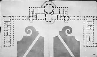 In the outskirts of Bonn, the capital of the Cologne Electorate, the ‘Kottenforst’ forest was a centre of such ‘par force’ hunts.[1] As from 1727, wide avenues were created.[1] And in the centre of these star shape radiated avenues, a hunting lodge was constructed between 1753 and 1761, Schloss Herzogsfreude.[1] The architect was Johann Heinrich Roth (1729-1788).[1]