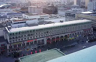 Opposite the new station, Schmohl & Stähelin partnered with Albert Eitel and Richard Bielenberg on the design for the Hindenburg building, constructed between 1926 and 1928, which contained offices, shops, and a theater. The very long prismatic structure borrows heavily from the New Objectivity (International Style) but retains a neoclassical austerity with a set of nine-meter-high arches in the center and the cladding in limestone tiles.[3][2]