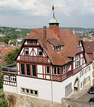 Early on the pair were influenced somewhat by the new style of Jugendstil, the German strands of Art Nouveau, popular around 1900 but quickly discarded amongst most German architects by 1905. Their completed residential commissions in the style include the Villa Schliz in Heilbronn (1901) and the Villa Franck in Murrhardt (1905–07), a castle-like mansion built on a hillside for a Ludwigsburg-based chicory manufacturer Robert Franck with a baroque exterior.[2] The latter includes a monumental staircase and forty-two rooms that employ Jugendstil décor and were technologically advanced for the time. In Murrhardt as well, they remodeled the Protestant parish church of St. Bartholomew, built in 1905–06, incorporating the late Gothic choir and tower into a new design that uses both Heimatstil and Jugendstil elements.[2] They employed a similar strategy in their contemporaneous remodeling of the evangelical parish church of St. Martin in Ebingen, choosing Jugendstil for the new sections of the building which they connected to the choir and sacristy, dating from 1473, and the lower part of the tower, originally built in 1670–72.[3]
