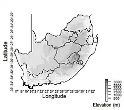 Schoenus arenicola mostly occurs near the south-western coast of South Africa, ranging from the Knysna area in the east to the Cape Peninsula in the west.[1] This species usually grows among fynbos vegetation at low elevations on well-drained sandy sites.[1]