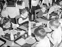 Free school meals in Finland are viewed as an investment for the future; the aim is to maintain and improve children's health, well-being, and learning.[65] The school meal is used as a pedagogical tool for teaching table manners, food culture, nutrition, and healthy eating habits, as well as for increasing the consumption of vegetables, fruits and berries, wholemeal bread, and skimmed or low-fat milk.[71][72] One of the basic lessons is cooperation between students, head teachers, teachers, parents, and catering staff. In many schools, students participate in the work of the school canteen during their working life practice period. Most schools have a school meal committee where students, teachers, and catering staff develop school catering together. Most schools also welcome parents to come and taste school meals. There are always adults present in the school restaurant. The pedagogical role of the school catering staff is seen as important, as is teachers' knowledge of nutrition. In 2009, Finland began developing school meal and nutrition education for teachers, and pedagogical education for school catering personnel.[73]