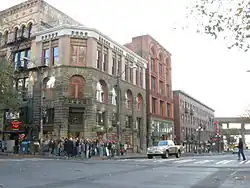 The three Schwabacher brothers' only sister, Bobette (Babette) Schwabacher (January 3, 1836 – January 7, 1908), married the brothers' business associate Bailey Gatzert in 1861.[1] The couple headed in 1869 for Seattle—then a town of barely 1,000 people—where Gatzert established a branch of Schwabacher Bros. & Company.[8] Gatzert would go on to become Seattle's first (and, as of 2009, only) Jewish mayor.[12] Schwabacher Bros. & Company became Seattle's first wholesaler, with a business opened October 11, 1869.[4] Schwabachers' 1872 Seattle office at Front Street (now First Avenue South) and Yesler Way was the city's first brick building.[4][13] Under Gatzert's direction, the company also constructed a warehouse,[8] a grist mill,[4] and Schwabacher's Wharf.[8]