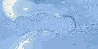 The southern edge of the plate is bordered by the Antarctic plate, forming the South Scotia Ridge, a left-lateral transform boundary sliding at a rate of roughly 7.4–9.5 mm/yr that occupies the southern half of the Antarctic-Scotia plate boundary.[9] The relative motion between the Scotia plate and the Antarctic plate on the western boundary is 7.5–8.7 mm/yr.[9] Though the South Scotia Ridge is overall a transform fault, small sections of the ridge are spreading to make up for the somewhat jagged shape of the boundary.[8]