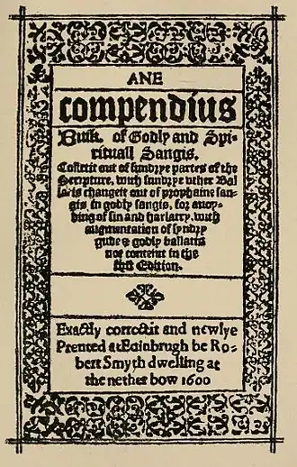 The Reformation had a severe impact on church music. The song schools of the abbeys, cathedrals and collegiate churches were closed down, choirs disbanded, music books and manuscripts destroyed and organs removed from churches.[90] The Lutheranism that influenced the early Scottish Reformation attempted to accommodate Catholic musical traditions into worship, drawing on Latin hymns and vernacular songs. The most important product of this tradition in Scotland was The Gude and Godlie Ballatis (1567), which were spiritual satires on popular ballads that have been commonly attributed to brothers James, John and Robert Wedderburn. Never adopted by the Kirk, they nevertheless remained popular and were reprinted from the 1540s to the 1620s.[99]