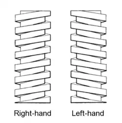 The helix of a screw's thread can twist in two possible directions, which is known as handedness. Most screw threads are oriented so that when seen from above, the screw shaft moves away from the viewer (the screw is tightened) when turned in a clockwise direction.[19][20] This is known as a right-handed (RH) thread, because it follows the right hand grip rule: when the fingers of the right hand are curled around the shaft in the direction of rotation, the thumb will point in the direction of motion of the shaft. Threads oriented in the opposite direction are known as left-handed (LH).