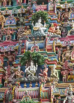 Other Pallava temples with sculpture surviving in good condition are the Kailasanathar Temple, Vaikunta Perumal Temple and others at Kanchipuram,[50] and the cave temples at Mamandur. The Pallava style in stone reliefs is influenced by the hardness of the stone mostly used; the relief is less deep and detail such as jewellery minimized, compared to further north. The figures are more slender and "delicately built and project sweetness and unmannered delicacy and refinement";[51] much the same figure type is continued in Chola sculpture in both stone and bronze. In large narrative panels some of the subjects are distinctively Tamil, such as Korravai (Durga as goddess of victory), and Somaskanda, a seated family group of Shiva, his consort Parvati and Skanda (Murugan) as a child.[52]