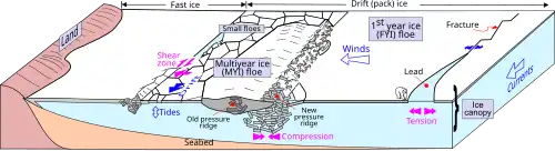 While fast ice is relatively stable (because it is attached to the shoreline or the seabed), drift (or pack) ice undergoes relatively complex deformation processes that ultimately give rise to sea ice's typically wide variety of landscapes. Wind is the main driving force, along with ocean currents.[1][5] The Coriolis force and sea ice surface tilt have also been invoked.[5] These driving forces induce a state of stress within the drift ice zone. An ice floe converging toward another and pushing against it will generate a state of compression at the boundary between both. The ice cover may also undergo a state of tension, resulting in divergence and fissure opening. If two floes drift sideways past each other while remaining in contact, this will create a state of shear.