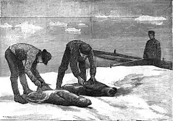 Inuit seal hunting accounts for the majority of the seal hunt, but just three percent of the hunt in southern Canada; it is excluded from the European Commission's call in 2006 for a ban on the import, export and sale of all harp and hooded seal products.[16] Ringed seals were once the main staple for food, and have been used for clothing, boots, fuel for lamps, as delicacy, containers, igloo windows, and in harnesses for huskies. Though no longer used to this extent, ringed seals are still an important food and clothing source for the people of Nunavut.[17] Called nayiq by the Central Alaskan Yup'ik people, the ringed seal is also hunted and eaten in Alaska.