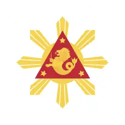 A circular white shield with an eight-rayed golden-yellow Philippine sun at the center. Overlapping the Philippine sun is a red equilateral triangle. Inside and at the center of the equilateral triangle is the traditional golden-yellow sea lion (Ultramar) of the Coat-of-Arms granted to the City of Manila in 1596, on guard with a sword on its right paw, at hilt. Inside and at the corner of each of the three (3) angles of the equilateral triangle, a five-pointed golden-yellow star to represent Luzón, Visayas, and Mindanao, respectively.