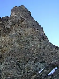 Then the party proceeded directly towards the summit, over rocks which for some distance were not particularly difficult until they reached a steeper part of the ridge. Here opinions were divided; Gorret suggested ascending by the ridge and scaling the last tower straight up. Carrel was inclined to traverse to the west of the peak, and thence go up on the Zmutt side. Naturally the wish of Carrel prevailed, for he was the leader and had not lost the habit of command, notwithstanding his defeat. The work at this part was of the very greatest difficulty, and stones and icicles which fell rendered the position of the party very precarious; so much so that they preferred to turn up directly towards the summit, and climb by rocks that Gorret termed "almost perpendicular." The traverse back to the southwest ridge was one of the greatest difficulty and a falling stone wounded Gorret in the arm.[3][4]