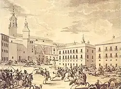 Entrance of General Álava during the Battle of Vitoria in the Napoleonic French Invasion. Drawing located in the Kutxabank archives. (circa 1813). Here seen the two towers crowning the plaza.The Plaza de la Virgen Blanca in 1833, Vitoria-Gasteiz, with its two original towers. Still today exist one of this towers rising in the plaza. Drawing by Scottish painter David Roberts, published in the book by English Thomas Roscoe "The Tourist in Spain: Biscay and the Castiles", published in 1837 by Lloyd, R.