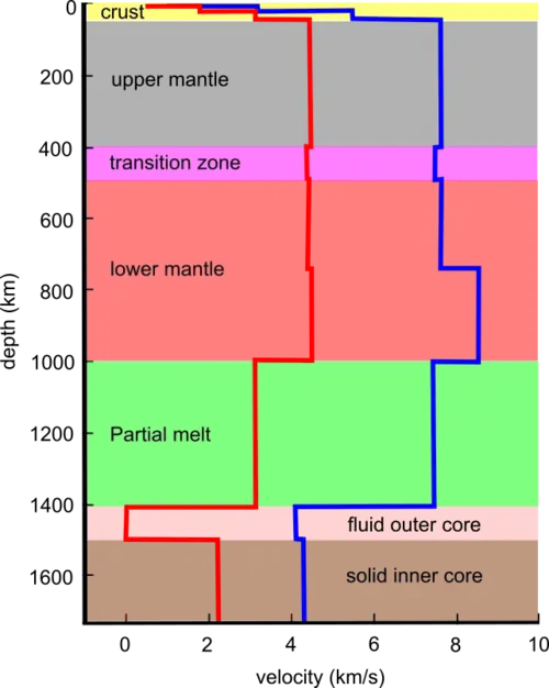 The sharp decline in P-wave velocity at the mantle-core boundary suggests a liquid outer core, transitioning from 7.7 km/s in the mantle to 4 km/s in the outer core.[59] The inability of S-waves to traverse this zone further confirms its fluid nature with molten iron sulphate.[60]