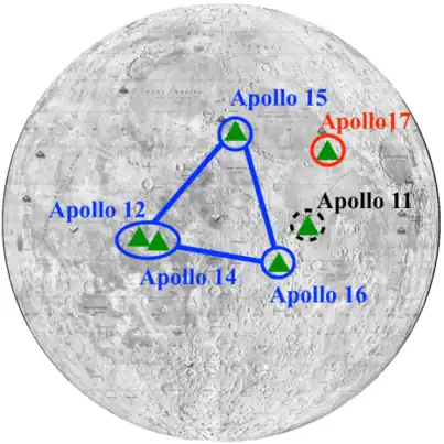 Knowledge of the Moon's seismic velocity primarily stems from seismic records obtained by Apollo missions' Passive Seismic Experiment (PSE) stations.[50] Between 1969 and 1972, five PSE stations were deployed on the lunar surface, with four operational until 1977.[50] These four stations created a network on the near side of the moon, configured as an equilateral triangle with two stations at one vertex.[51] This network recorded over 13,000 seismic events, and the gathered data remains a subject of ongoing study.[50][51] The analysis has revealed four moonquake mechanisms: shallow, deep, thermal, and those caused by meteoroid impacts.[52]