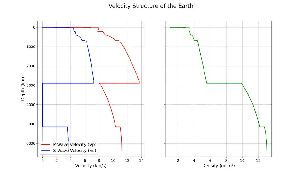 Seismic waves traverse the Earth's layers at speeds that differ according to each layer's unique properties, with their velocities shaped by the respective temperature, composition, and pressure.[1] The Earth's structure features distinct seismic discontinuities where these velocities shift abruptly, signifying changes in mineral composition or physical state.[30]