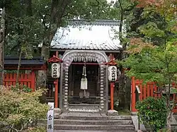 Sekizan Myōjin is worshiped in the Tendai school of Japanese Buddhism.[39] His temple is known as Sekizan zen'in (赤山禅院).[26] It is located on the western foot of Mount Hiei, to the northeast of Kyoto.[3] The location was selected based on the fact that the eastern side already was the site of a shrine dedicated to the deity Sannō (山王).[6] It was originally erected in 864 by Anne (安慧; 795–868), one of the disciples of Ennin, but was destroyed after his death, only to be subsequently rebuilt in 884, after Sekizan Myōjin reportedly appeared in a dream of the priest Sōō (相応; 831–918).[3] Shortly after that, he gained additional prestige due to emperor Uda and emperor Daigō promoting him.[13] In 993, during the early confrontations between Sanmon and Jimon, monks affiliated with the former of these two branches of Tendai occupied Sekizan zen'in, which resulted in a complaint to the imperial court from their opponents residing at Mount Hiei.[26] Today Ema depicting Sekizan Myōjin can be deposited in the temple as votives.[3] He also appears on ofuda issued by it.[40]