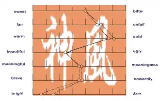 ![]() Fig. 1. Modern Japanese version of the Semantic Differential. The Kanji characters in background stand for "God" and "Wind" respectively, with the compound reading "Kamikaze". (Adapted from Dimensions of Meaning. Visual Statistics Illustrated at VisualStatistics.net.) | |