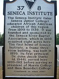 The first president of the Seneca Institute was Rev. Dr. John J. Starks. He was born in what is now rural Greenwood County. He served the Seneca Institute for thirteen years. He left to become the president of Morris College in Sumter, South Carolina. After serving as its president from 1912 to 1930, he became the president of Benedict College in Columbia, South Carolina. He served as its president until his death.