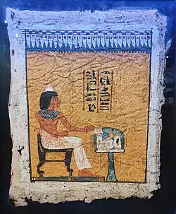 Sennefer was an Ancient Egyptian official with the title "servant in the Place of Truth" at the end of the 18th Dynasty. He is mainly known due to his unlooted burial found in 1928 by excavations under Bernard Bruyère at Deir el-Medina.[1] The burial chamber of Sennefer was found within the tomb of the servant at the place of truth Hormes (tomb no. 1159a). The small chamber contained the inscribed coffins of Sennefer[2] and his wife Nefertiti. Both were found wrapped in linen. Sennefer was also adorned with a mummy mask. He had a heart scarab and was adorned with a pectoral.[3] On his coffin was placed a painted piece of cloth, showing Sennefer before an offering table.[4] Furthermore, the burial contained different types of furniture, including a bed, a box, a head rest and several pottery as well as stone vessels. The burial of a child in an undecorated box was found, too.[5] Two shabti figures are datable by style to the end of the 18th Dynasty.[6]