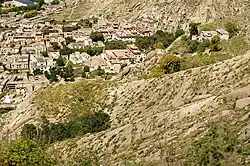 The hermitage complex faces south. It has several structures built along the west–east direction. The "yellow retreat hut" seen here was the main hermitage of Tsongkhapa’s (1357–1419). According to a local legend, the ‘local site-spirit’ (gzhi bdag) used to enter through a small window in this house to meet Tsonkhapa. A further legend is that a fresco of Tsongkhapa on the wall in the room is stated to be a speaking-statue, an “image that speaks” (gsung byon ma).[1][3]