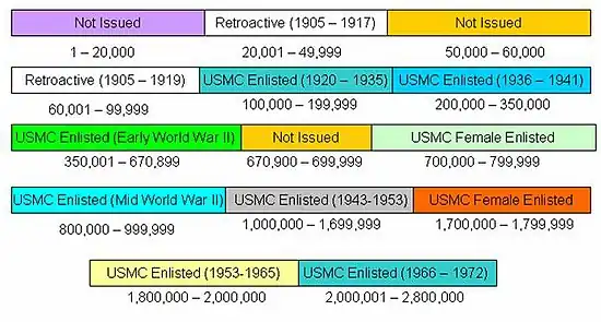 The enlisted service numbers between 50,000 and 60,000 were never assigned by the Marine Corps for reasons which are unclear. The next range of numbers, 60,001 to 99,999, were used for retroactive presentation from 1905 to 1919.