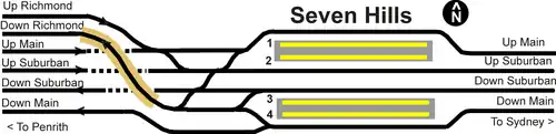 Seven Hills railway station is a heritage-listed railway station located on the Main Western line, serving the Sydney suburbs of Kings Langley, Lalor Park, Seven Hills and Seven Hills West.[3] It is served by Sydney Trains' T1 Western and T5 Cumberland line services.