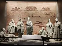 The seven scholars are Wang Can, Chen Lin, Ruan Yu (阮瑀), Liu Zhen (劉楨), Xu Gan, Ying Yang (應瑒), and Kong Rong.[2]